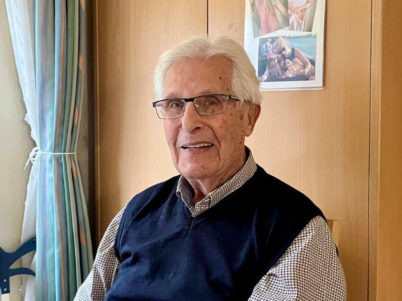 Seniorenwohnanlage, sitzt der Jubilar ruhig und freundlich am Tisch. Neben ihm